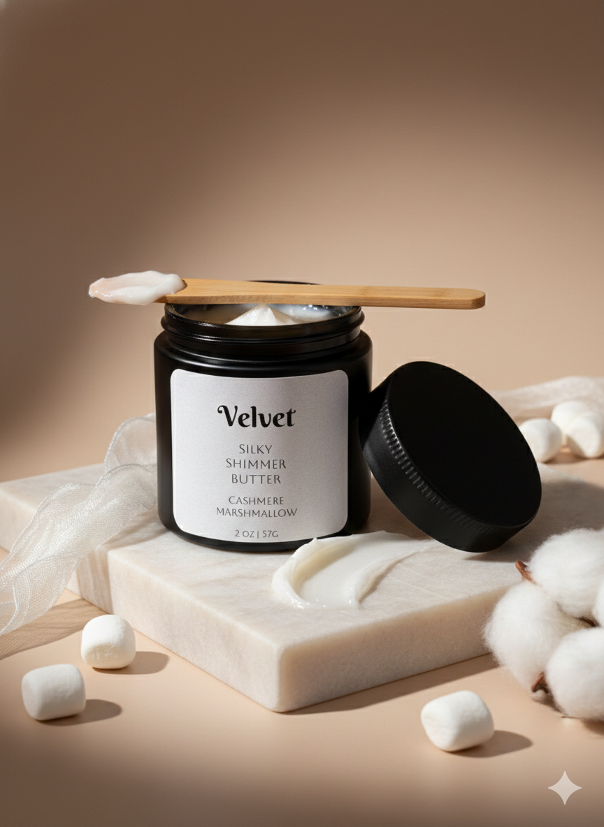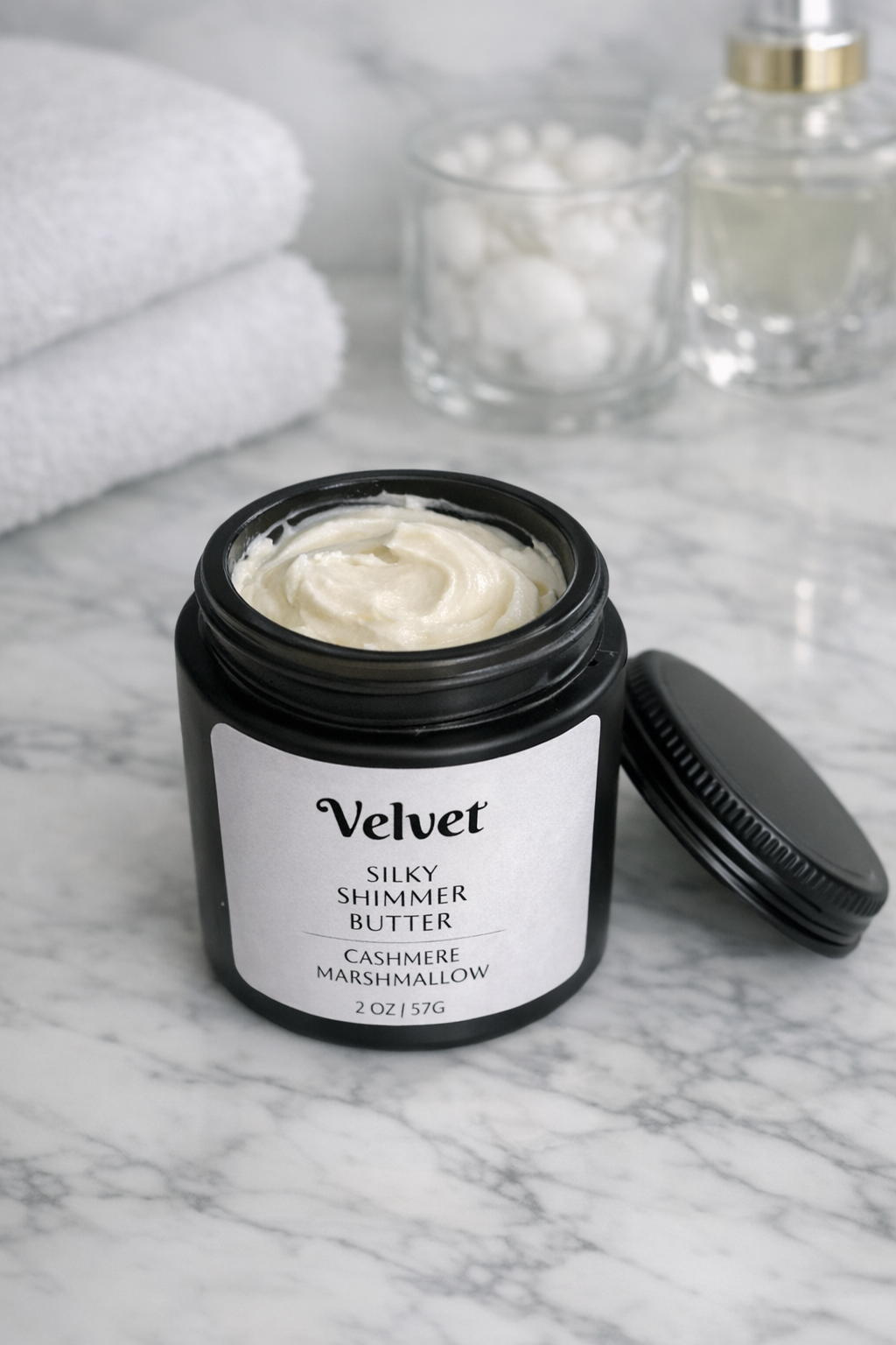 Silky Shimmer Body Butter is a handcrafted body cream designed for a sophisticated, light-catching radiance. With a unique silk-to-powder finish, it provides deep, non-greasy hydration and a velvet-soft feel that allows you to get dressed immediately after application.